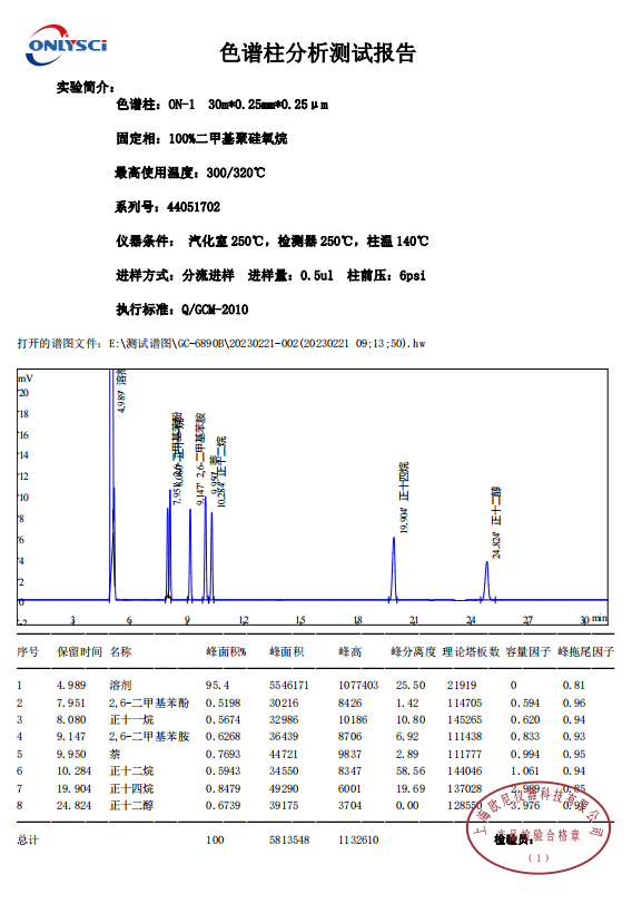 ON-1毛细管色谱柱是由高纯100%甲基聚硅氧烷键合交联制成,独特的键合交联技术使得ON-1毛细管色谱柱具有极高的柱效和非常低的柱流失率,并有非常长的柱寿命。